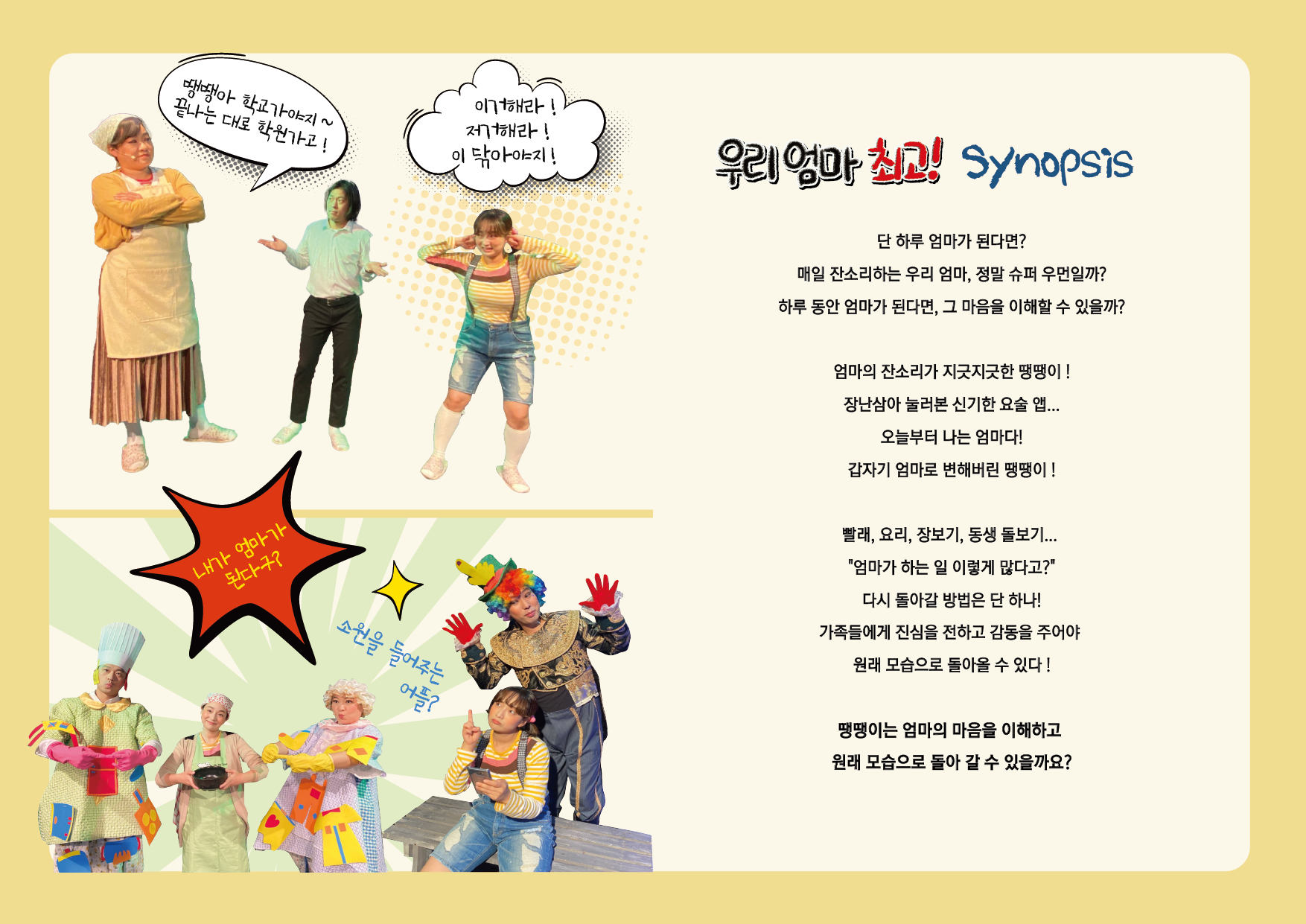 우리 주변에 있는 ‘엄마’와 ‘가족’의 이야기를 따뜻하게 담아낸 가족뮤지컬 〈우리 엄마 최고!〉는 일상 속에서 당연하게 지나쳤던 엄마의 사랑과 가족의 의미를 아이들의 시선으로 풀어낸 창작 가족뮤지컬입니다. 신나는 라이브 음악과 이해하기 쉬운 이야기, 밝고 유쾌한 무대 구성으로 어린이부터 어른까지 모두가 함께 공감하며 즐길 수 있는 공연입니다. 이 작품은 ‘완벽한 엄마’가 아닌, 서툴지만 최선을 다하는 엄마의 모습을 그려냅니다. 아이들은 무대 위 이야기를 통해 자연스럽게 가족의 소중함을 느끼고, 어른들은 웃음과 함께 마음 한편이 따뜻해지는 순간을 경험하게 됩니다. < 작품 특징 > 아이 눈높이에 맞춘 스토리 어렵지 않은 전개와 친근한 캐릭터로 처음 공연을 접하는 어린이도 쉽게 몰입할 수 있습니다. 라이브 음악과 배우들의 생동감 있는 연기 현장에서 직접 연주되는 음악과 배우들의 에너지가 어우러져 공연의 몰입도를 높입니다. 웃음과 감동이 균형 잡힌 가족극 재미에만 치우치지 않고, 공연이 끝난 뒤 가족 간의 대화로 자연스럽게 이어질 수 있는 메시지를 담고 있습니다. 공공기관·문화회관·교육기관 초청에 적합한 작품 문화회관 기획공연, 학교·유치원·어린이집 단체 관람, 지역 문화행사 등 다양한 공간과 목적에 맞게 운영 가능합니다.